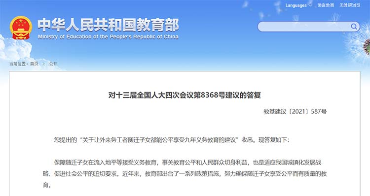 近日,教育部網(wǎng)站公布對(duì)《關(guān)于讓外來務(wù)工者隨遷子女都能公平享受九年義務(wù)教育的建議》的答復(fù)。答復(fù)中表示,保障隨遷子女在流入地平等接受義務(wù)教育,事關(guān)教育公平和人民群眾切身利益,也是適應(yīng)我國城鎮(zhèn)化發(fā)展戰(zhàn)略、促進(jìn)社會(huì)公平的迫切要求。