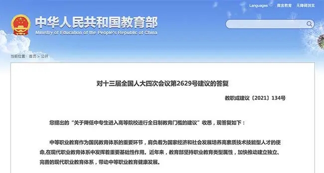 近日,教育部在《對十三屆全國人大四次會議第2629號建議的答復(fù)》中,對提出的“關(guān)于降低中專生進(jìn)入高等院校進(jìn)行全日制教育門檻的建議”進(jìn)行了答復(fù)。