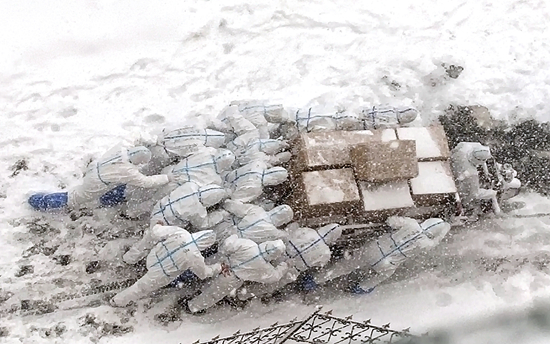 1月6日,在因新冠肺炎疫情被封閉的大連海洋大學校園內,志愿者推著滿載的三輪車上坡,將物資送往學生宿舍。新華社發(大連海洋大學供圖)