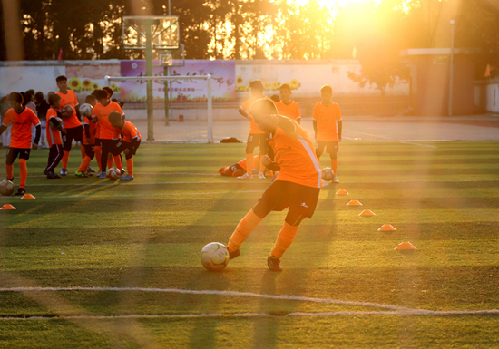 12月22日,湖南省婁底市,漣源市橋頭河鎮中心小學,學生在課后服務中進行足球練習。視覺中國供圖
