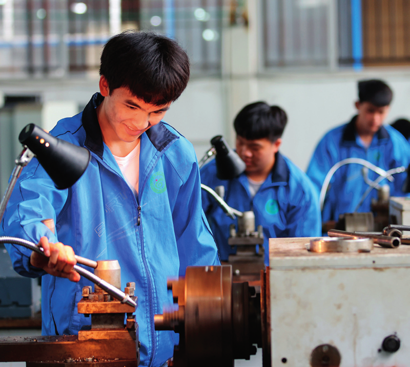 2022年4月27日,貴州省黔東南苗族侗族自治州岑鞏縣中等職業(yè)技術(shù)學(xué)校,學(xué)生在實(shí)訓(xùn)室加工軸類零件 胡攀學(xué)攝 / 本刊