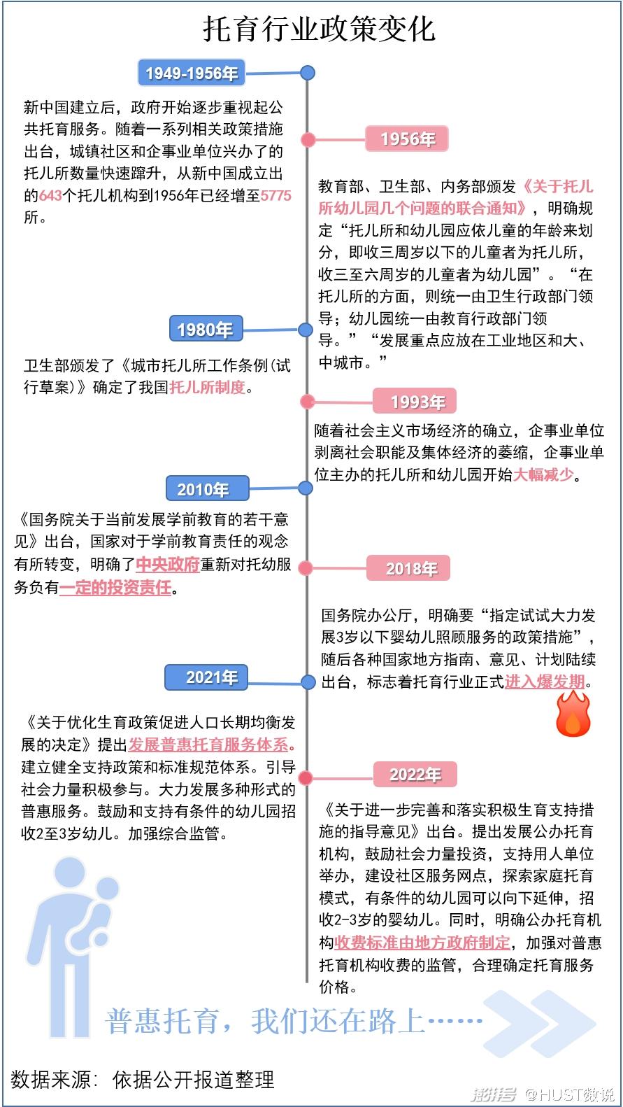 從近代以來,中國嬰幼兒教育開始由完全的家庭教育緩慢地向社會化教育轉化。中國嬰幼兒教育事業從1978年進入新發展階段,伴隨著相關制度、條例的推出,托育體系逐步確立,托兒所數量穩步上升。但是90年代后托育行業熱度驟減,直到2010年后才又逐漸起步,在最近幾年又進入爆發階段。托育行業的興衰與國家政策和政府導向有著密不可分的關系。