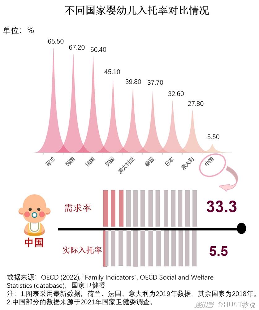 但與超三成嬰幼兒家庭存在強烈的入托需求相對應的是我國嬰幼兒在各類托育機構的入托率僅為5.5%左右,遠遠低于OCED(經合組織)【2】國家的平均水平。巨大的反差折射出當前我國較突出的托育服務供需矛盾。