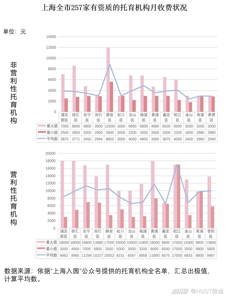 以上海為例,全市237家有資質的托育機構中營利性質托育機構占到七成左右,最高收費達到了18000/月,中端機構的定價在5000-8000元,即便是低端的價格也不低于3500元。地方人社局數據顯示,2021年上海市平均工資11396元/月,雙職工家庭月收入在2萬元左右。