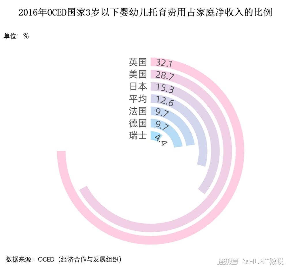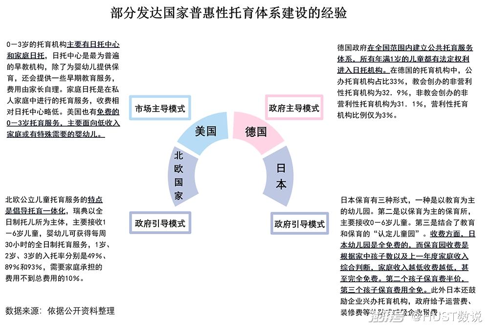 在發展普惠托育的道路上,已經有不少發達國家建立較為完備的普惠性托育體系。目前國際上主要有三種托育服務模式:一是市場主導模式,以英美國家為主,國家只保障最低限度的福利水平,但總體來說兒童托育費用基本由家庭承擔。二是政府主導模式,以北歐國家和法國、德國等高福利國家為代表,認為政府應該加強公共托育基礎設施建設,提供普惠的嬰幼兒服務。第三種是政府引導模式,以日本為代表,主張以家庭為主,政府起到積極的引導作用,提供育兒假、經濟補助等家庭支持政策協助父母解決兒童照顧問題。在不同的托育服務模式下,0-3歲嬰幼兒托育費用占家庭凈收入的比重也有所不同。