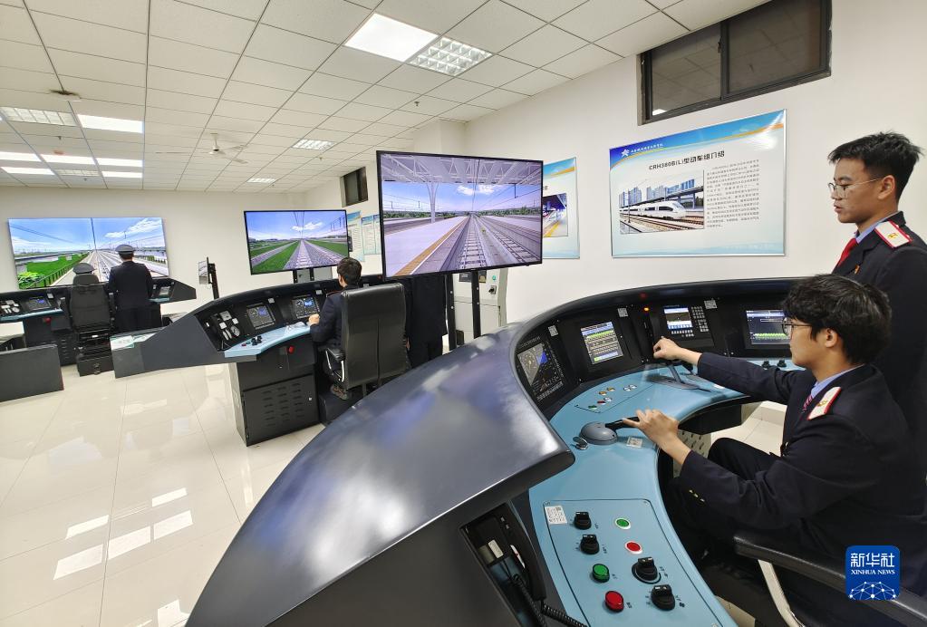 在西安鐵路職業(yè)技術(shù)學(xué)院,學(xué)生在課堂上進(jìn)行動車組駕駛與運(yùn)用實(shí)訓(xùn)演練(2022年4月29日攝)。新華社記者 李一博 攝